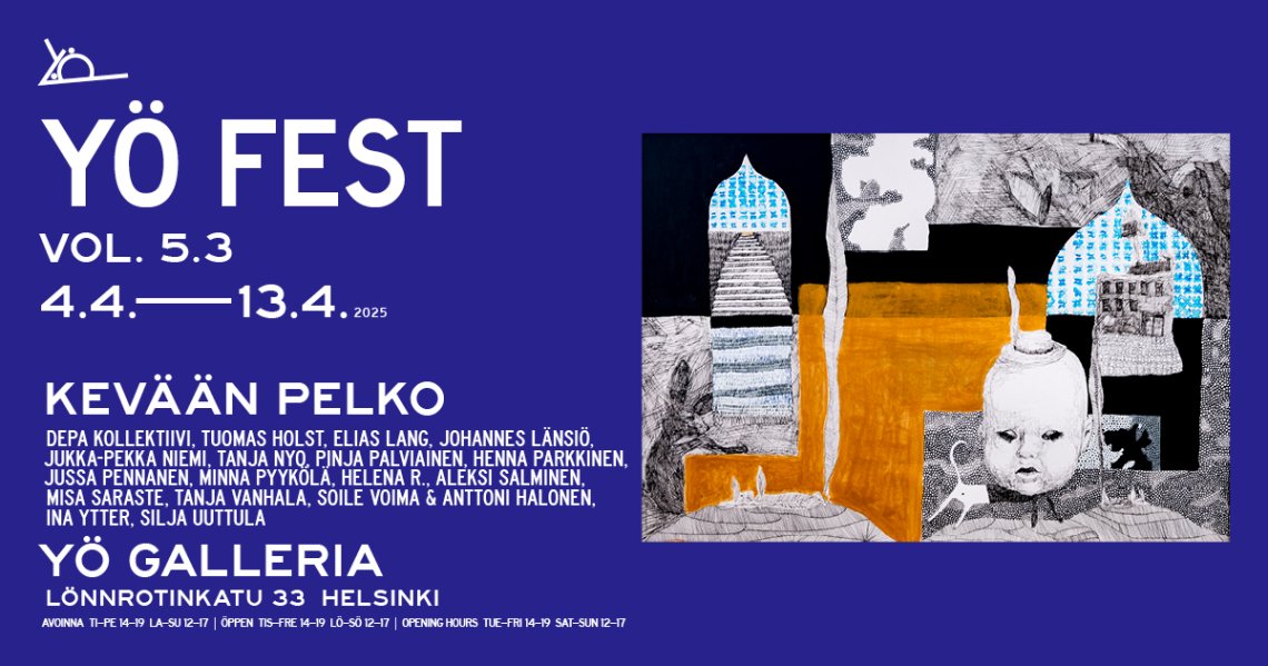 Yö Fest on taideyhteisö Yö ry:n vuotuinen monitaidefestivaali Helsingin ytimessä. Yö ry:n jäsentaiteilijoiden teokset on kuratoitu neljäksi ryhmänäyttelyksi. Festivaali huipentuu esittävien taiteiden viikoihin toukokuussa. Tule ja koe taidetta!
