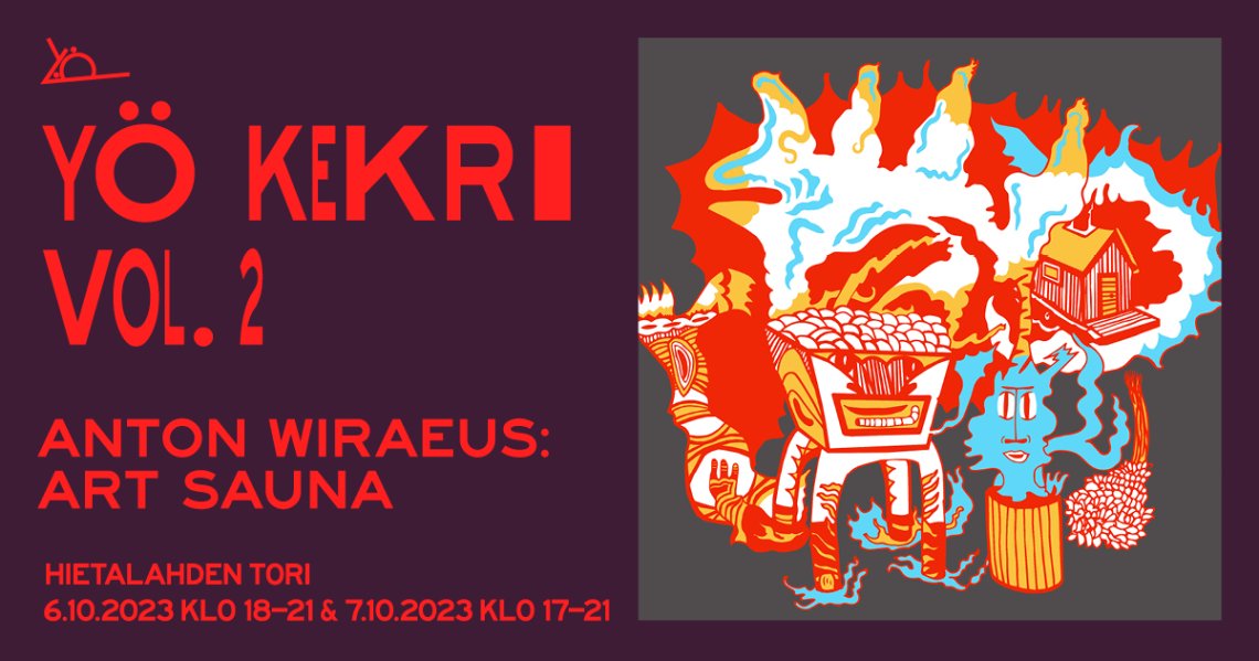Yö Kekri vol.2 Anton Wiraeus: Art Sauna pe 6.10. klo 18-21 la: 7.10. klo 18-21 Hietalahden tori Art Saunalla: 6.10.Vainaja: Löylyn luvut klo 20.30 7.10.Lepäävät nartut klo 18.30 Tapani Pirog klo 20